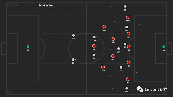 因此,如果对手使用五后卫,瓜迪奥拉将使用六名球员进入到锋线。如果他们的前锋线上有两名球员,那么瓜迪奥拉将使用三后卫(因此是3-1-6)。如果该队采用的防守阵型是5-4-1(锋线只有一名球员),瓜迪奥拉将采用2-2-6。