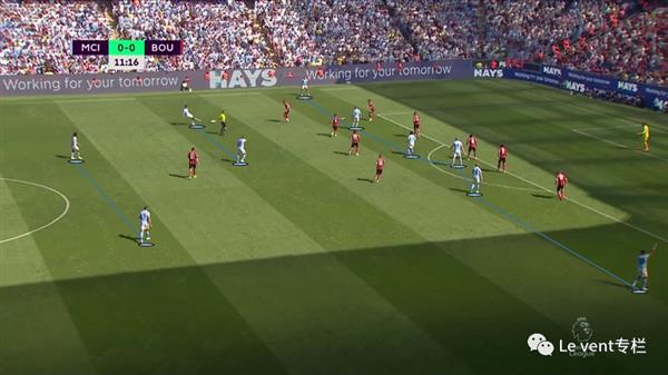 当曼城对阵伯恩茅斯时,后者以5-4-1的阵型进行防守。曼城以2-2-6的形式进行比赛。2个后腰大于一个前锋,锋线上的6人在人数超过他们后卫线上的5人,边后卫和边锋以及中场则可以在局部制造人数优势。