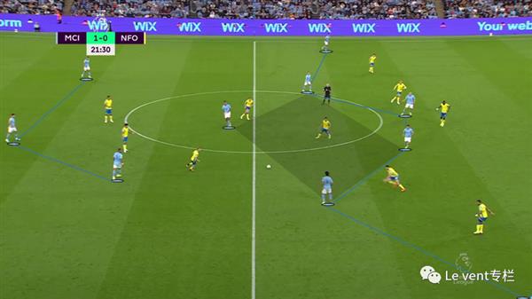 诺丁汉森林的防守阵型是5-3-2,所以曼城构建了3-1-6的阵型,这种阵型近似于3-4-3菱形中场。我们可以看到,中场的布置可以使人数在局部上同时让对方的3中场和5后卫失去人数优势,前腰位置的球员可以摇摆以使得人数出现优势(译者注:参考围棋的打吃与反打吃)。