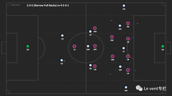 如果遇到球队在防守时采取了中路收紧的4-2-3-1,并且没有让前腰去配合中锋压迫中卫(就像4-4-2那样),曼城就会采取2-3-5两个边后卫收紧到中场的阵型。在这种情境下,曼城几乎不对对手的双后腰做专门的工作,而是去覆盖边路空间,两个边锋往回落到中场线,利用边路三人的局部优势去发展进攻。