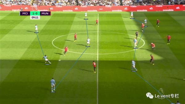 曼联在比赛中采取了4-2-3-1的阵型,但是在防守中会让前腰或者边锋脱离位置去压迫曼城的中卫,曼城则采取了两个边后卫站位靠边的2-3-5的阵型应对,这样的站位布置可以使得后腰京多安和中锋哈兰德能够接到占据肋补的德布劳内和伯纳多·席尔瓦的地面传递。在每一个局部都是人数优势。这个阵型的关键在于时刻保持后腰、边后卫和边锋的三角形站位关系,这样的布置使得在三条线上都能造成人数优势,并且扯动曼联的防线。