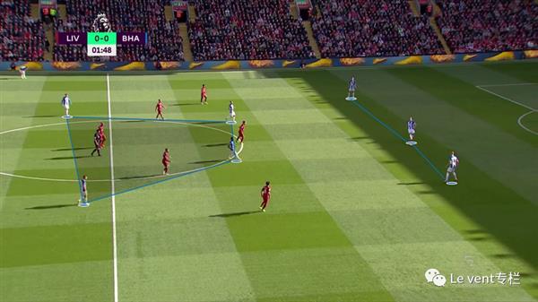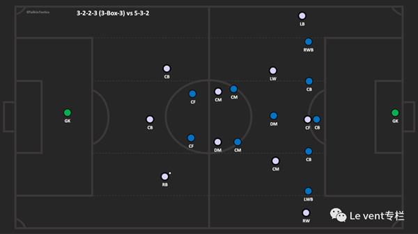 接下来谈谈另一个体系,尤其是打三中卫为主的球队,3-2-2-3平行中场。布莱顿用这个阵型应对利物浦,波特之前也是采取了这个阵型。布莱顿的2名前腰人数上大于利物浦的单后腰,同时加上锋线的6人也大于利物浦的4后卫+门将(考虑到建立进攻时门将的参与)。