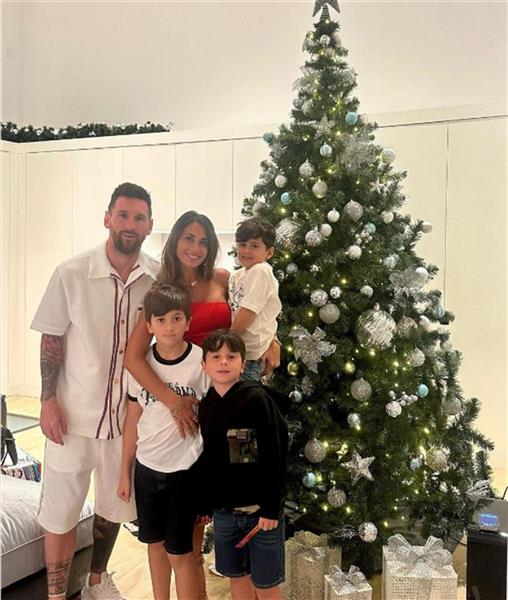 梅西一家站在圣诞树旁 (图源:sportsbrief)