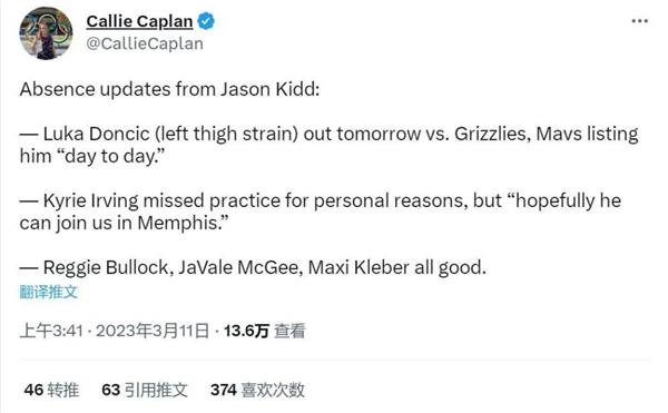 北京时间3月11日,独行侠教练基德透露,欧文今天因个人原因缺席了训练,预计他将在孟菲斯与球队合作。由于左大腿拉伤,东契奇决定错过明天对阵灰熊的比赛,欧文怀疑右脚疼痛。许多球迷都很好奇,欧文的个人原因是什么?
