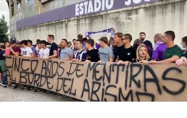 “五年的谎言,现在接近深渊,已经足够了,”巴拉多利德球迷拉出的横幅!