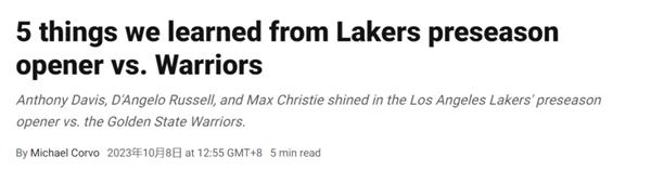 北京时间10月8日,湖人队在季前赛中108-125不敌勇士队,詹姆斯和里夫斯在这场比赛中缺席,浓眉和拉塞尔也只打了上半场。湖人队记者MichaelCorvo分析了湖人队季前赛第一场比赛的五件事——