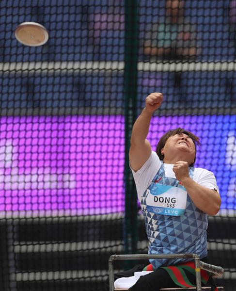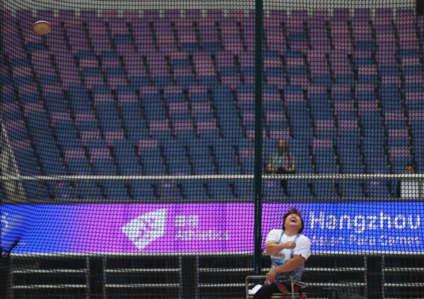 当日,在杭州第4届亚残运会田径项目女子铁饼F54/55级决赛中,中国选手董飞霞以26.35米的成绩夺冠。