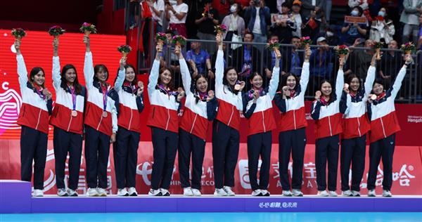 当日,在杭州亚运会女子排球决赛中,中国队以3比0战胜日本队,获得冠军。