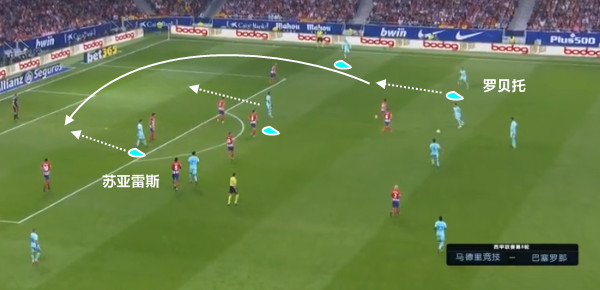 马竞方面的优势在于,他们的前锋灵活性很强,尤其是卡拉斯科作为边锋,他在内切之后还有很强的传球能力。这样一来,中场球员科克和萨乌尔可以形成随即地前插进攻。这次萨乌尔的移动,正好刺透了巴萨的中场防线,由于巴萨后卫不能及时前顶,面前自然一片开阔。