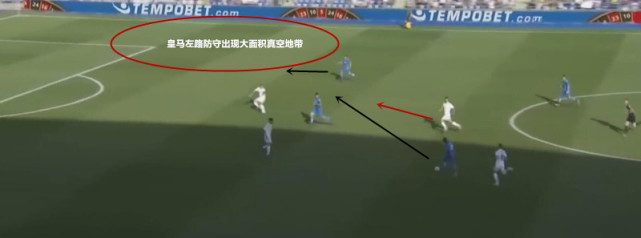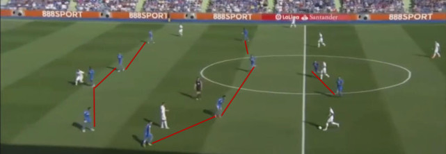 而赫塔费的4-4-2在阵地防守时更加低位,基本全员回收到本方半场,依靠整体跑动保持阵型的紧凑感,就地采取上抢干扰皇马的出球,并且不惜用犯规制止。