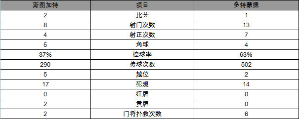 全场比赛,多特蒙德13次攻门7次射正打入1球,斯图加特8次攻门4次射正则收获两球。多特蒙德控球率达到63%,却负于控球率37%的斯图加特。