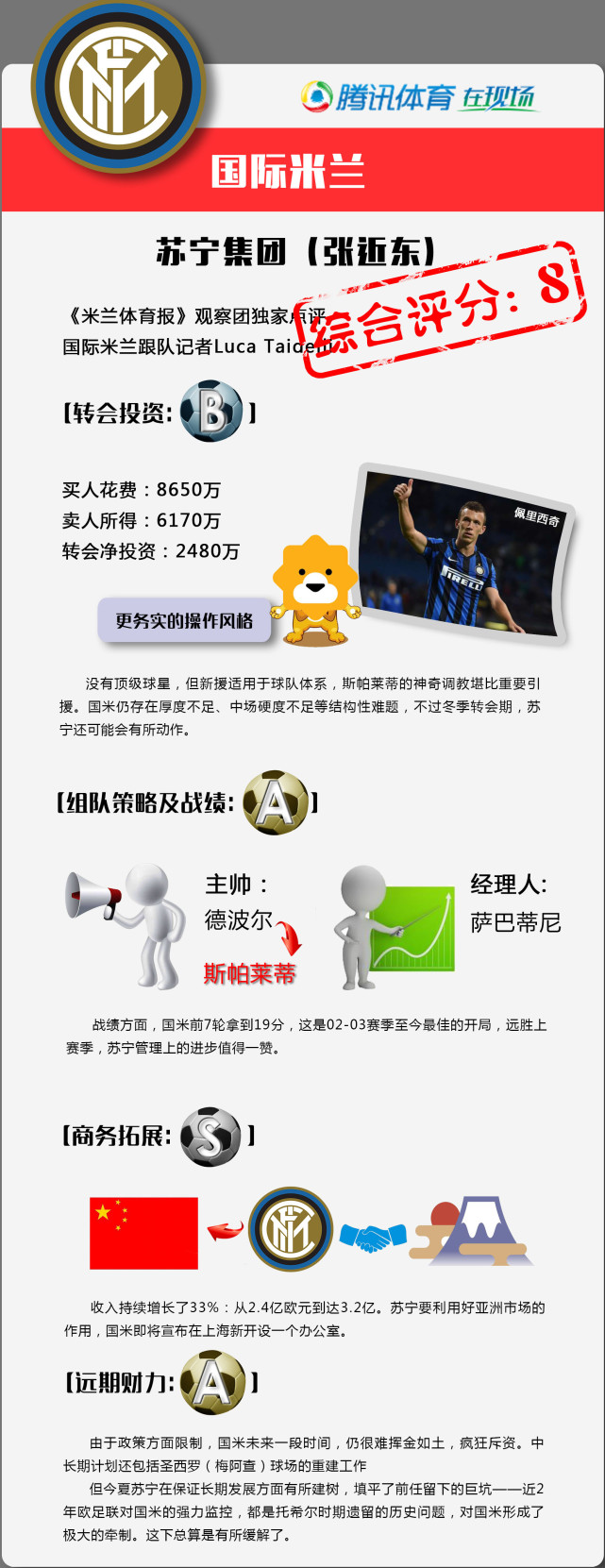 财力运用:6分 苏宁的中长期计划要用时间来检验,关键点之一还包括梅阿查球场的重建工作,张氏家族一直在推进工程尽早实施,但需要米兰俱乐部的同意。苏宁唯一的问题是要消化去季马里奥和加布里埃尔两笔交易带来的负面影响,他们对外部经纪人的信任造成了这个结果。