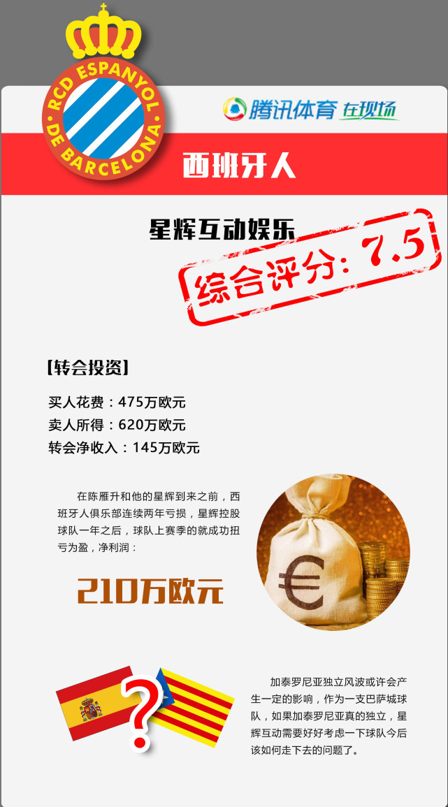 星辉互动收购西班牙人45%的股份的价格仅为1400万欧元的白菜价,对于这样一家有着百年历史的老牌俱乐部,星辉以如此低廉的价格收购可谓是相当划算,之后星辉也实现了完全控股。