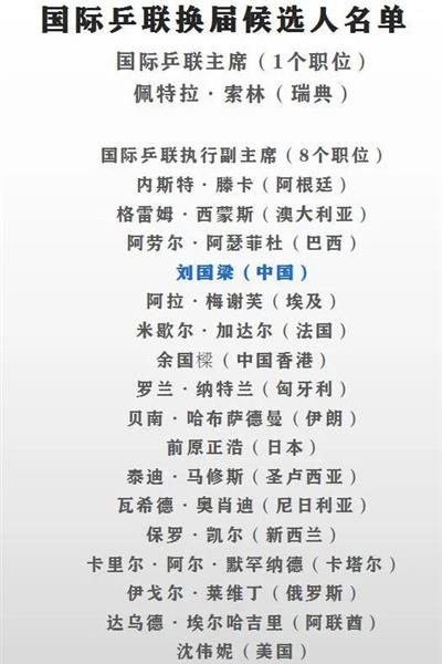 值得一提的是,11 月 24 日,国际乒联也将在休斯敦举办换届选举,届时将选举产生 9 名国际乒联履行委员会成员,包括国际乒联主席 1 名和履行副主席 8 名,9 名当选人的任期为四年。他们将连同国际乒联运动员委员会主席普里莫拉茨、国际奥委会成员柳承敏组成完整的国际乒联履行委员会。而参选国际乒联履行副主席的刘国梁在竞选视频中表示,他将努力使乒乓球开展为国际最大的运动项目之一,“乒乓球是我国的国球,我作为我国乒协主席申请加入国际乒联执委会,期望代表我国乒协更深层次地融入到国际乒乓球大家庭。如果我当选,我能够向你们保证,在我的领导下,我国将在国际乒乓球业务中发挥越来越积极的作用,我将与你们所有人一起努力,使咱们的乒乓球运动成为国际上最大的运动项目之一。”