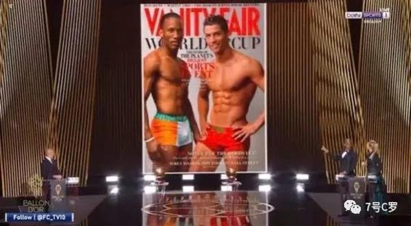 颁奖典礼现场还摆出了c罗和德罗巴当年的肌肉合影