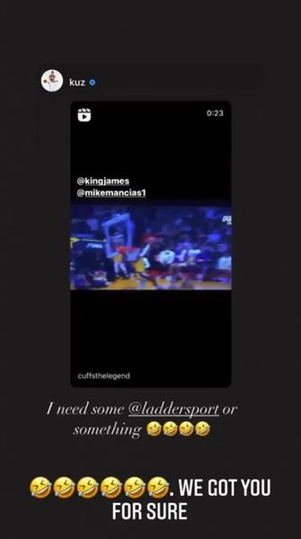 随后,詹姆斯与奇才前锋凯尔-库兹马展开互动。库兹马转发詹姆斯的空接视频短片,并写道:“@詹姆斯 @mikemancias(詹姆斯训练师)我需要一些@laddersports 或别的什么东西(注:詹姆斯的训练师将他自己为詹姆斯调制的纯天然营养冲剂创立为ladder品牌市售)