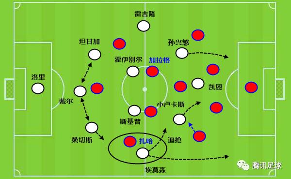 尽管热刺的高位逼抢没能拿到皮球,不过对手的进攻发起是走边路加速,这也是英超球队的惯用做法。