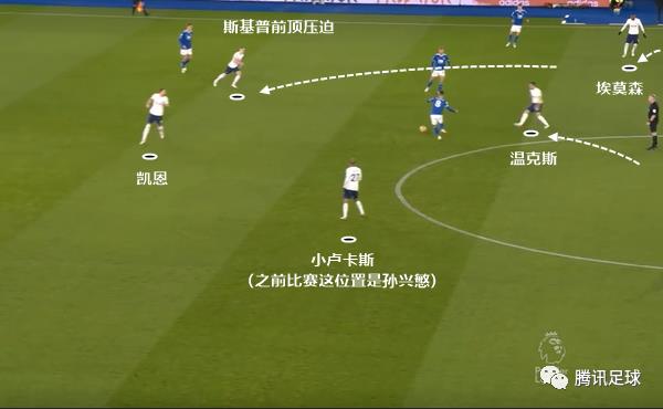 从下图的站位可以看到,斯基普的前顶幅度很大,同时后腰温克斯也顶上来。埃莫森的站位同样很高,目的是抓对手的失误。