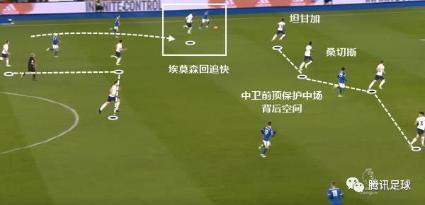 再来看看这一次的退防,因为中场传球出现失误,右路的埃莫森还在前场没回来。于是右中卫坦甘加扩大防区到侧翼,后腰温克斯回防。