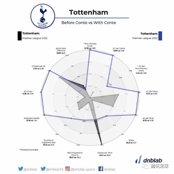 对比前任努诺,孔蒂麾下的热刺在进攻端的优势过于巨大。