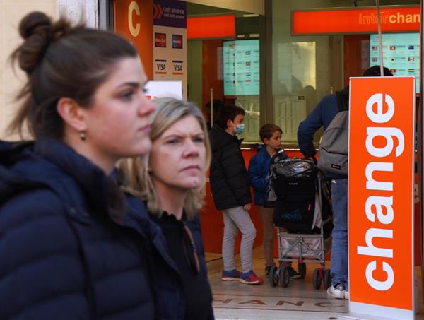 3月2日,人们走过意大利罗马的一处货币兑换点。新华社记者 金马梦妮 摄